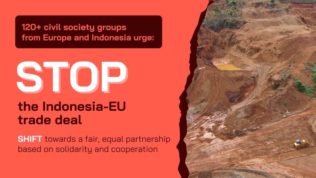 - EU dan pemerintah Indonesia harus menghentikan perundingan Indonesia-EU CEPA, karena perjanjian tersebut menimbulkan ancaman terhadap lingkungan dan iklim, serta terhadap hak-hak perempuan, Masyarakat Adat, pekerja, petani kecil, dan nelayan.